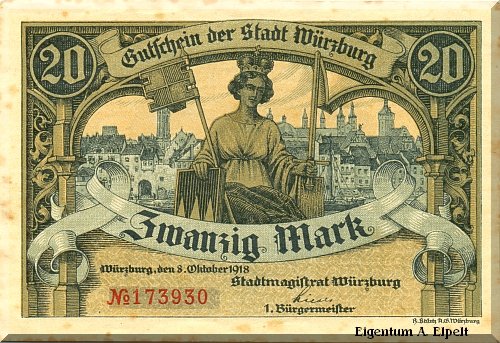 Dieser 20-Mark-Schein zeigt die Frankonia mit dem fränkischen Rechen und dem Würzburger Fähnchen. Ausgabe vom 8. Oktober 1918. Der SChein stammt aus dem Besitz von Aribert Elpelt, Waigolshausen, das Copyright unterliegt den damaligen Herstellern.