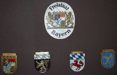 Aufgang des Rathauses in Moosinning: Wappen von Bayern, Oberbayern, Landkreis Erding und Moosinning (von links).