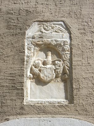 Stadtwappen von Wunsiedel über einer Tür im Spitalhof, vor dem Fichtelgebirgsmuseum