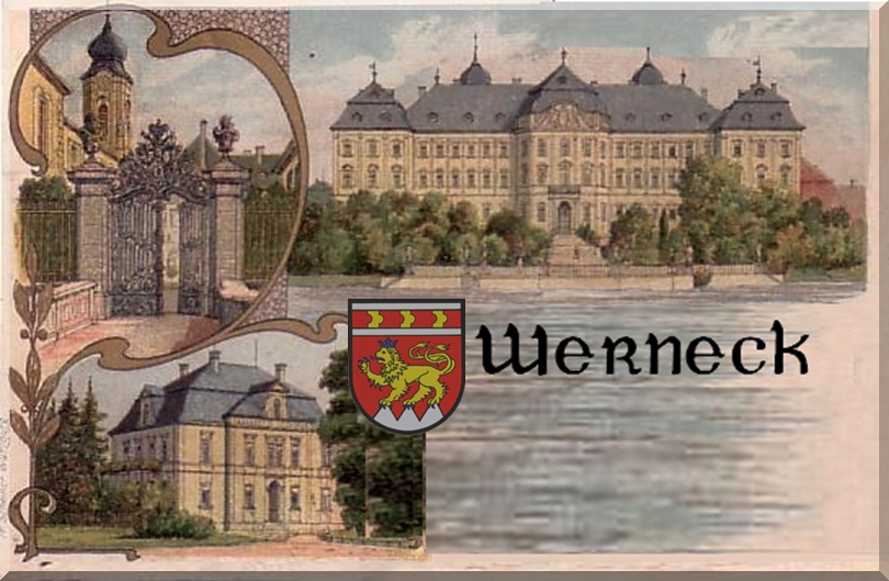 Diese Ansichtskarte mit dekorativen Elementen des Jugendstils stammt aus der Zeit der Jahrhundertwende. Sie zeigt das Barockschloss in Werneck. Die Karte hat der Besitzer Aribert Elpelt aus Waigolshausen mit dem Wappen von Werneck versehen.