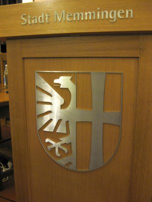 Rednerpult mit dem Stadtwappen im Rathaus von Memmingen