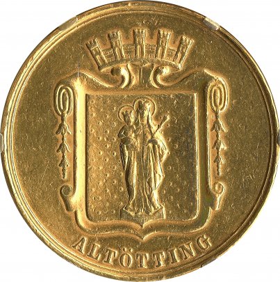 Bürgermeistermedaille ALTÖTTING, von 1914. Für Altötting als Stadt (ab 1898) geprägt in Massivgold vom Bayerischen Hauptmünzamt München. Das Hoheitszeichen mit leider entfernter Trageöse hängt in einen Ring gefasst an der aktuellen Amtskette.