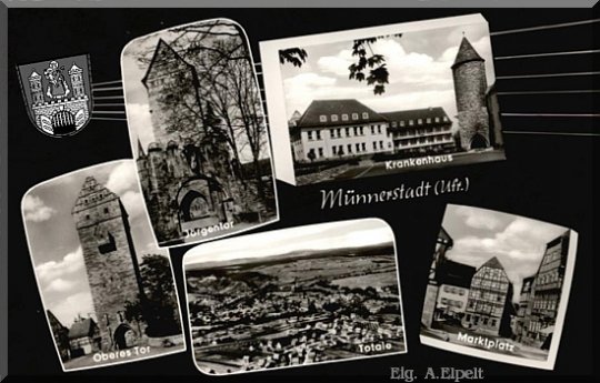 Die Ansichtskarte von 1963 zeigt das Wappen der Gemeinde Münnerstadt und verschiedene Ansichten, wie das ehemalige Krankenhaus, das obere und das Jörgentor sowie den Marktplatz und die Totale. Die Ansichtskarte ist in besitz von ARbert Elpelt aus Waigolshausen, der auch das Foto zur Verfügung stellt; das Copyright liegt beim Herausgeber der Karte.