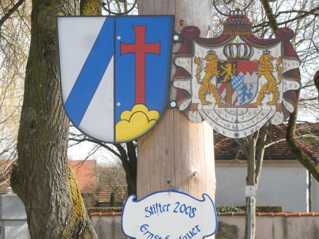 Das Wappen von Geltendorf gemeinsam mit dem Wappen von Bayern an einem Maibaum