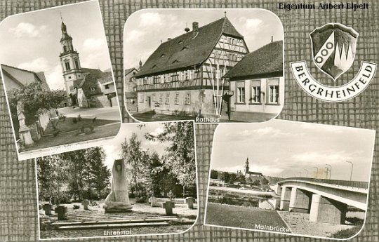 Die Karte aus den 1960er-Jahren zeigt Ansichten aus Bergrheinfeld und das mit dem Ortsnamen unterfangene Wappen der Gemeinde Bergrheinfeld. Die Ansichtskarte wurde vom Herausgeber, einem Herrn Östreicher aus Bergrheinfeld, entworfen und vertrieben. Sie ist im typischen Stil der 50er-/60er-Jahre gestaltet mit gerundeten, locker positionierten "Bildfenstern" auf einem gitterartig gemusterten Hintergrund. Die Karte stammt aus dem Besitz von Aribert Elpelt, Waigolshausen, der freundlicherweise auch das Foto zur Verfügung gestellt hat.
