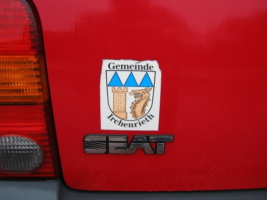 Ein Aufkleber mit dem Gemeindewappen an einem roten Auto