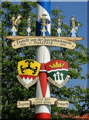 Am Maibaum sind die Wappen von Sulzfeld und Rhön-Grabfeld zu sehen, darüber die Jugendblaskapelle.