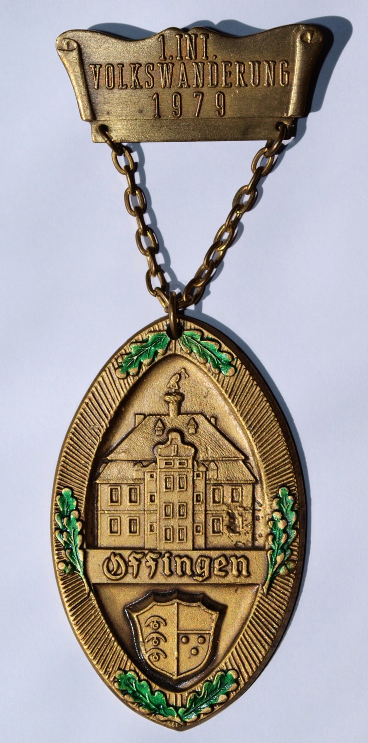 Das Offinger Ortswappen auf der Medaille zur 1. Internationalen Volkswanderung in Offingen 1979