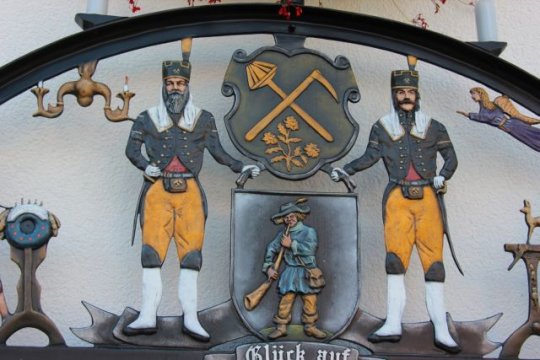 Das Dietenhofener Wappen (unten) am Rathaus Dietenhofen - im ensemble mit dem Bergwerkszeichen und zwei Bergleuten als Wappenhalter