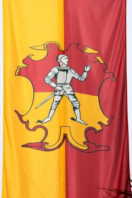 Das Wappen des Marktes Kirchheim (hier seitenverkehrt) auf der Fahne