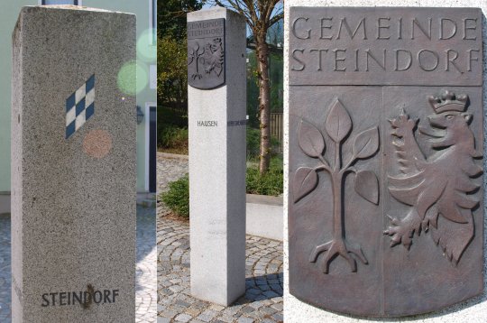 Die Wappenstele in Steindorf zeigt das Gemeidnewappen und auf der Rückseite farbig eingelegt die bayerischen Rauten