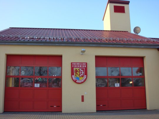 Das Gemeindewappen im Abzeichen der Freiwilligen Feuerwehr Burgpreppach am örtlichen Feuerwehrdepot