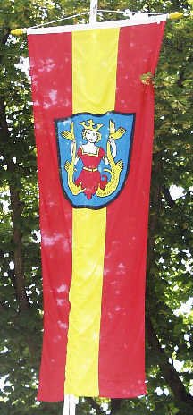 Gemeindeflaggen mit Wappen in unterschiedlichen Ausführungen (während des Volksfestes im Juni 1999).