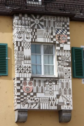 Das Moosburger Wappen am Erker eines Geschäftshauses am Moosburger Münsterplatz