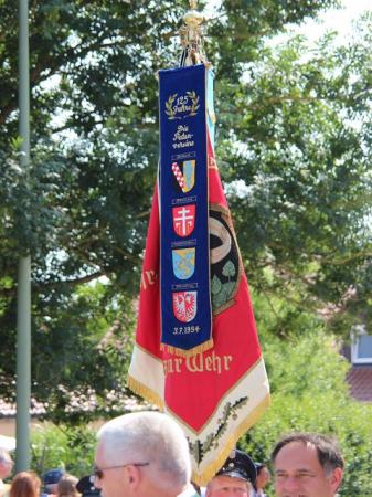 Das Fahnenband mit den Wappen aller Schwabmünchner Ortsteile: Birkach, Klimmach, Mittelstetten, Schwabegg