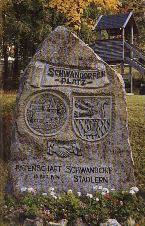 1974 wrude zwischen der Gemeinde Stadlern und der Kreisstadt Schwandorf eine Patenschaft geschlossen. Der Schwandorfer Platz im Ortszentrum von Stadlern erinnert daran. Der Gedenkstein zeigt rechts das Schwandorfer Wappen, links eine Ortsansicht von Stadlern mit der Wallfahrtskirche Mariä Himmelfahrt.