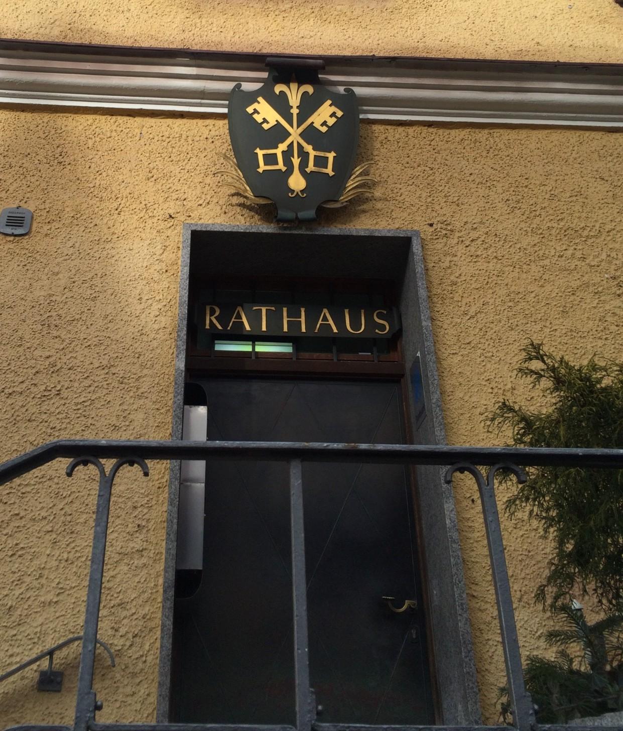 Gemeindewappen über dem Eingang zum Rathaus Burtenbach