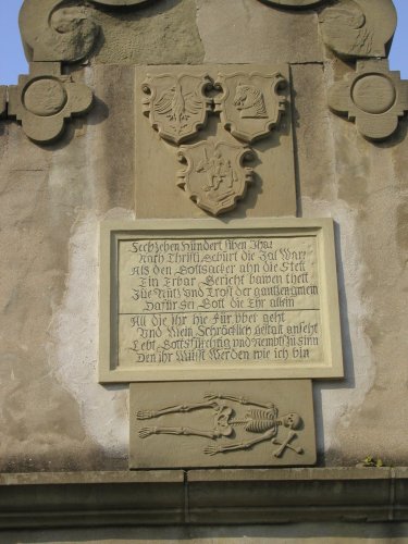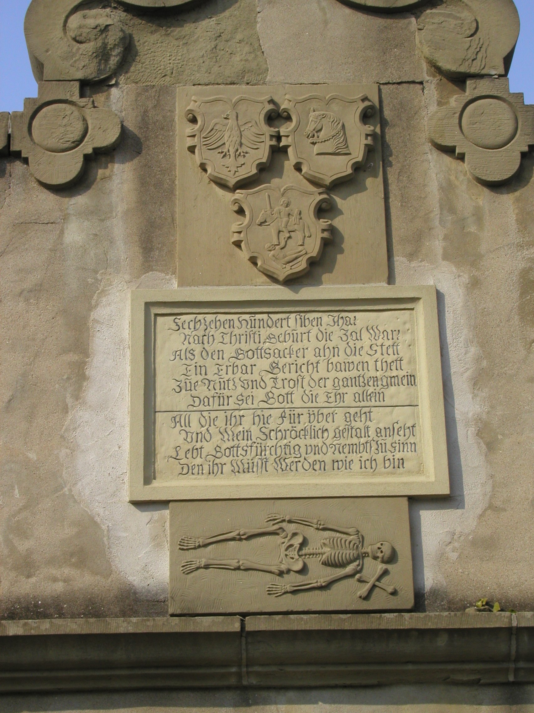Die drei Wappen über dem Segnitzer Friedhofsportal erinnern an die einstigen Dorfherren, die Markgrafen von Ansbach-Brandenburg und an die Freiherren von Zobel, darunter St. Martin, der Patron der Segnitzer Kirche. Die Inschrift unter den Wappen verrät das Baujahr 1607. Ein weiterer Text und ein Gerippe mahnen die vorüber gehenden, dass man einst auch einmal so aussehen wird.