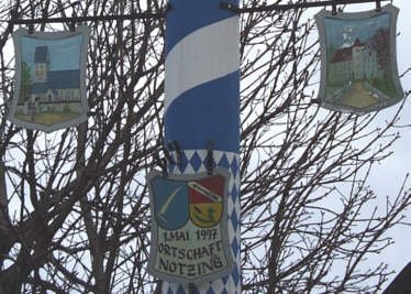 Maibaum in Notzing: Neben dem Notzinger Wappen das Wappen von Oberding, zu dem Notzing seit 1976 gehört