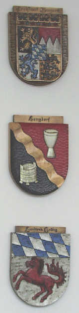 Holzwappen im Sitzungssall im Rathaus Lengdorf (von oben: Bayern, Lengdorf, Landkreis Erding).
