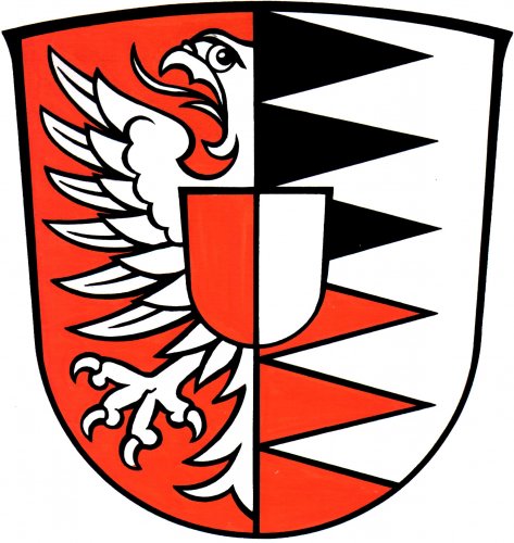Wappen gespalten, mit Herzschild gespalten von Rot und Silber. Vorne in Rot ein halber silberner Adler am Spalt. Hinten in Silber drei schwarze und drei rote Spitzen am Spalt.