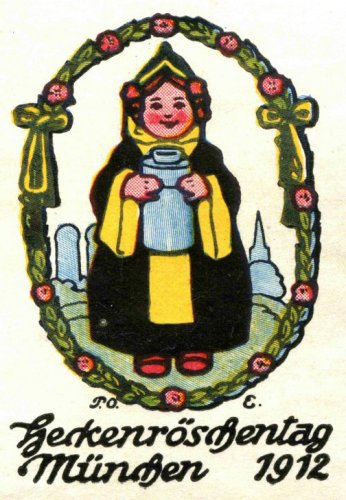 Das Münchner Kindl präsentiert auf dieser Postkarte eine Spendenbüchse und spielt dabei auf den Zweck der Postkarte an. Bei den zu Beginn des 20. Jahrhunderts regelmäßig veranstalteten "Blumentagen" wurden von den Damen der Gesellschaft Postkarten, Briefmarken oder Blumensträuße verkauft. Der Erlös diente einem guten Zweck.