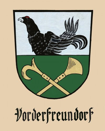 Auch Vorderfreundorf verrät mit seinem Wappen, was hier früher gewesen ist: ein Birkhahn weist auf die reichen Jagdgründe hin, Trifthaken und Schälmesser, einen sogenannten "Scheppser", benötigten die Männer von Vorderfreundorf für die Holztrift auf dem Osterbach, die vor allem im 19. Jahrhundert Arbeit und Brot brachte.