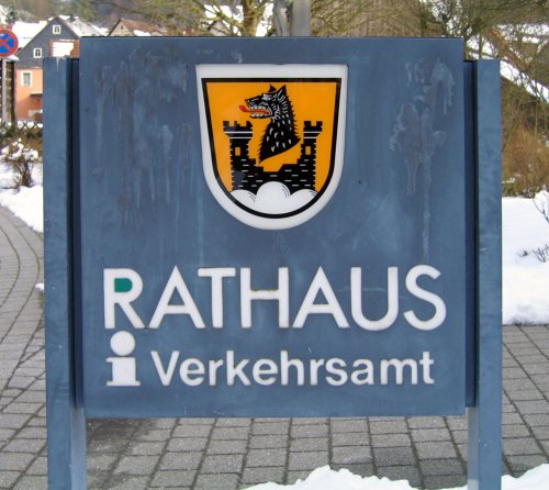 Das Gemeindewappen von Obertrubach (Ofr.) vor dem örtlichen Rathaus