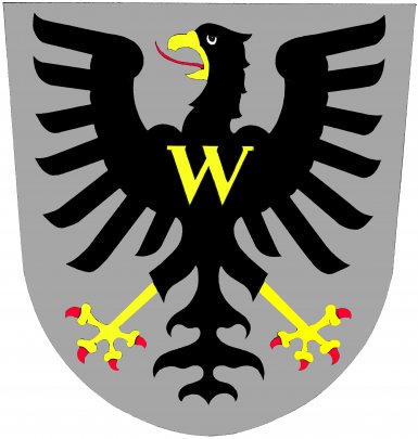 Das Stadtwappen wurde im Laufe der letzten Jahrzehnte modernsiert und zeigt jetzt in klaren Strukturen den schwarzen Adler auf silbernem Grund mit goldenem W auf der Brust.