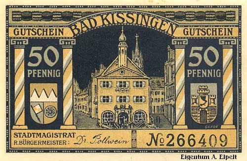 Dieser 50-Pfennig-Notschein der Stadt Bad Kissingen zeigt das Wappen von Unterfranken und der Stadt Bad Kissingen. Der Schein stammt aus dem Besitz von Aribert Elpelt, Waigolshausen, das Copyright unterliegt den damaligen Herstellern.