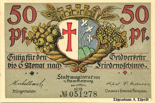 Der 50-Pfennig-Schein vom 10. März 1918 mit dem liebevoll umrahmten Stadtwappen stammt aus dem Besitz von Aribert Elpelt, Waigolshausen. Das Copyright unterliegt den damaligen Herstellern.