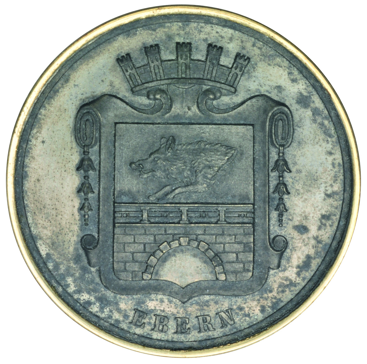 Beschreibung: Mit dem Rückseitenstempel geprägter einseitiger Probeabschlag in Blei der Bürgermeistermedaille EBERN, um 1870, Bayerisches Hauptmünzamt München.