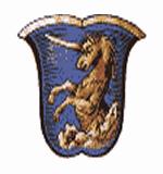 In Blau ein aus silbernem Felsen hervorwachsendes silbernes Einhorn.