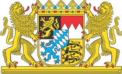 AMTLICHE WAPPENBESCHREIBUNG (BLASONIERUNG) Das Große Bayerische Staatswappen besteht aus einem gevierten Schild mit einem Herzschild. Das erste Feld zeigt in Schwarz einen aufgerichteten goldenen, rotbewehrten Löwen; das zweite Feld geteilt von Rot und Silber mit drei aus dem Silber aufsteigenden Spitzen; das dritte Feld zeigt einen blauen, goldbewehrten Panter auf silbernem Grund; im vierten Feld auf Gold drei schwarze übereinander angeordnete herschauende, rotbewehrte Löwen. Der Herzschild in Silber und Blau schräg rechts gerautet. Der Schild wird von zwei goldenen, rot bewehrten Löwen gehalten. Auf dem Schild ruht eine Volkskrone, bestehend aus einem mit Steinen geschmückten goldenen Reifen, der mit fünf ornamentalen Blättern besetzt ist. Zwei Löwen als Schildträger.