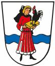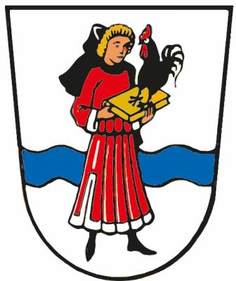 In Silber die linksgewendete, rot gekleidete Figur des heiligen Veit mit goldenem Buch und schwarzem Hahn; der Figur ist ein blauer Wellenbalken unterlegt.