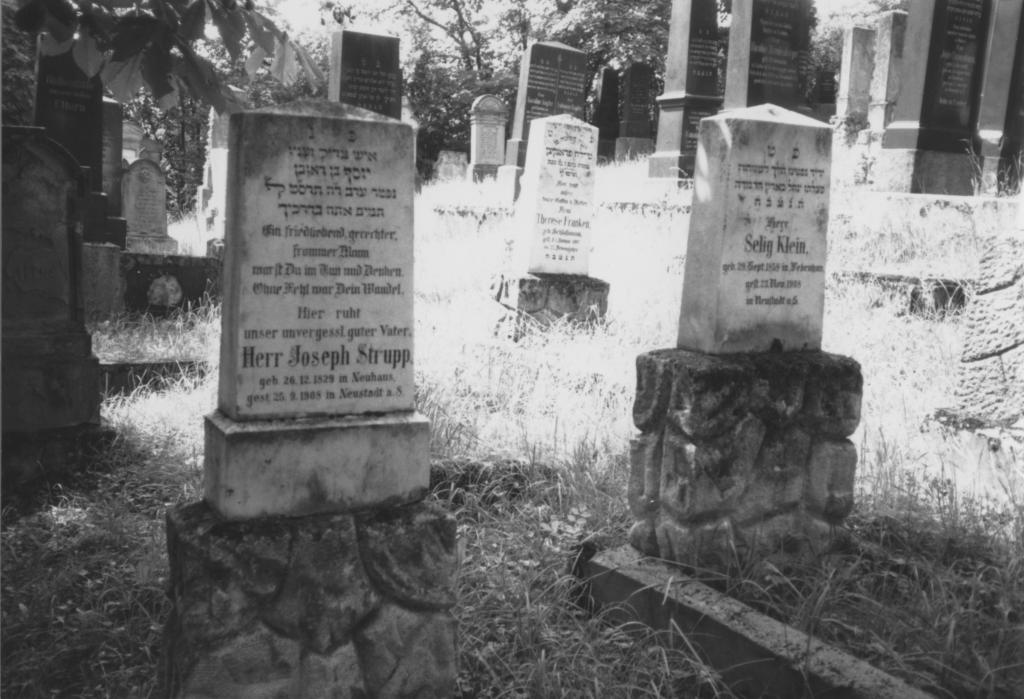 Besonderheiten: Fast 30 Grabsteine stammen aus dem jüdischen Steinmetzbetrieb Max Koppel in Nördlingen, einem der größten Arbeitgeber seiner Zeit in der Stadt. Die aus der Familie Koppel stammende Jette Koppel (gest. 1927) war mit dem Neustädter Isidor Franken verheiratet, was mit ein Grund für die zahlreichen Grabsteine der Firma Koppel gewesen sein könnte. Die formschönen Grabsteine der Firma Koppel – charakteristisch ist die Verwendung des schwarzen Syenit, eines magmatischen Tiefengesteins, mit der aufwändiger Goldschrift – findet man bis heute im süddeutschen Raum.