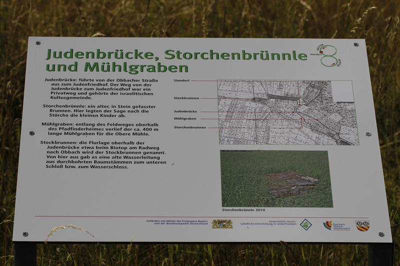 Euerbach in Richtung Obbach verlassen, ca. 200m hinter dem Ortsausgang rechts abbiegen und dem weißen Hinweisschild "Judenfriedhof" [sic] folgen.