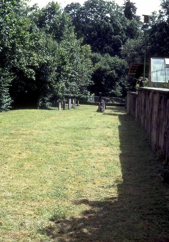 Beerdigungen: Im hinteren Teil ältere und neuere Grabsteine seit der Zeit um 1825, die teilweise nur als Kleinbruchstücke erhalten sind.