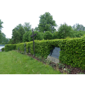 Nach dem Seiteneingang (Holztor) geradeaus, durch eine Buchenhecke vom Rest des Friedhofs abgetrennt, liegt das KZ-Reihengrab.