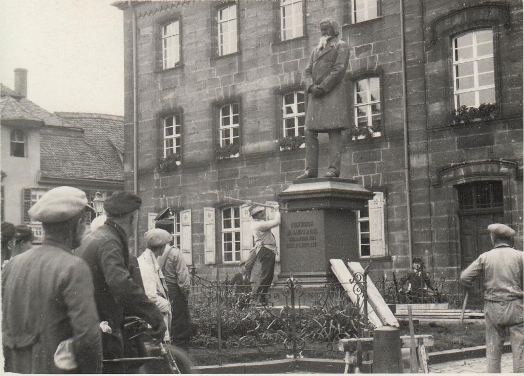 Von den wenigen überlebenden Gemeindemitgliedern kehrte nach dem Sturz der NS-Diktatur 1945 keines mehr nach Erlangen zurück. Im Jahr 1961 lebten insgesamt nur sechs jüdische Personen in der Stadt, gehörten jedoch der IKG Nürnberg gehörten. 1967 wurde an Jakob Herz' ehemaligem Wohnhaus in der Heuwaagstraße 18 eine Gedenktafel enthüllt, 1983 folgte eine Stele, die "Ein Denkmal für ein Denkmal" darstellen und an die ursprüngliche Statue erinnern sollte.