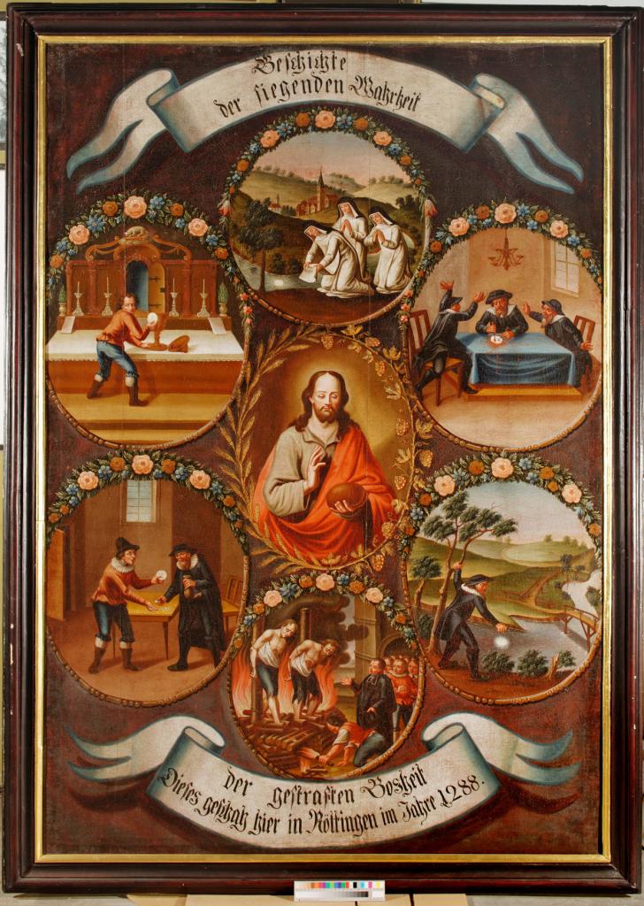 Auch im 19. und 20. Jahrhunderten blieben Juden der Stadt fern. Einerseits fehlten wirtschaftliche Anreize, schwerwiegender war aber wohl das abschreckende Kollektivgedenken an die großen Pogrome, die in Röttingen ihren Ursprung nahmen. Für lange Zeit hing im Langhaus der Pfarrkirche St. Kilian ein Ölgemälde aus dem Jahr 1815. Um ein zentrales Bildnis Christi beim Segnen des Brotleibs gruppierten sich sechs blumengeschmückte Kartuschen, in denen die Geschichte der Hostienschändung in teils drastischen Szenen nacherzählt wurde. Zwei Spruchbänder erläuterten dazu: "Geschichte der siegenden Wahrheit / der gestraften Bosheit. Dieses geschah hier in Röttingen im Jahr 1288 [sic]". Das Bild wurde auf Initiative der Gesellschaft für christlich-jüdische Zusammenarbeit in Unterfranken e.V. im Oktober 1988 entfernt und befindet sich heute als Leihgabe der Kirchenstiftung St. Kilian in Röttingen in der Kunstsammlung der Diözese Würzburg.