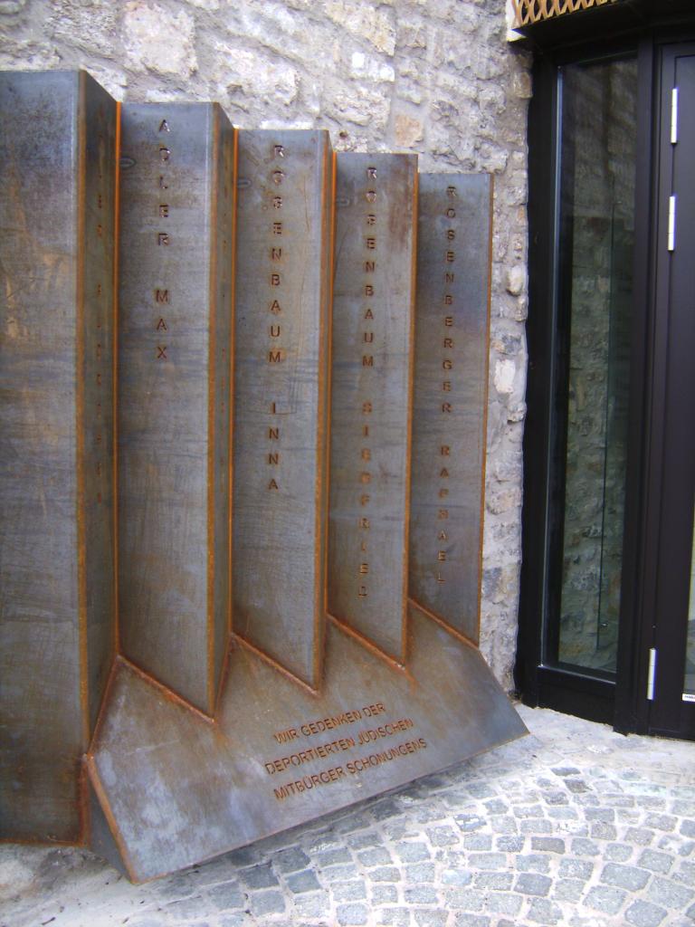 Im Jahr 1997 beschloss die Gemeinde Schonungen die Errichtung eines Gedenksteins gegenüber der ehemaligen Synagoge. Da die Verlegung von Stolpersteinen keine Mehrheit im Gemeinderat fand, wurde 2012 an der Außenwand des alten Rathauses ein metallenes Mahnmal angebracht, das an die deportierten jüdischen Schonunger erinnert.