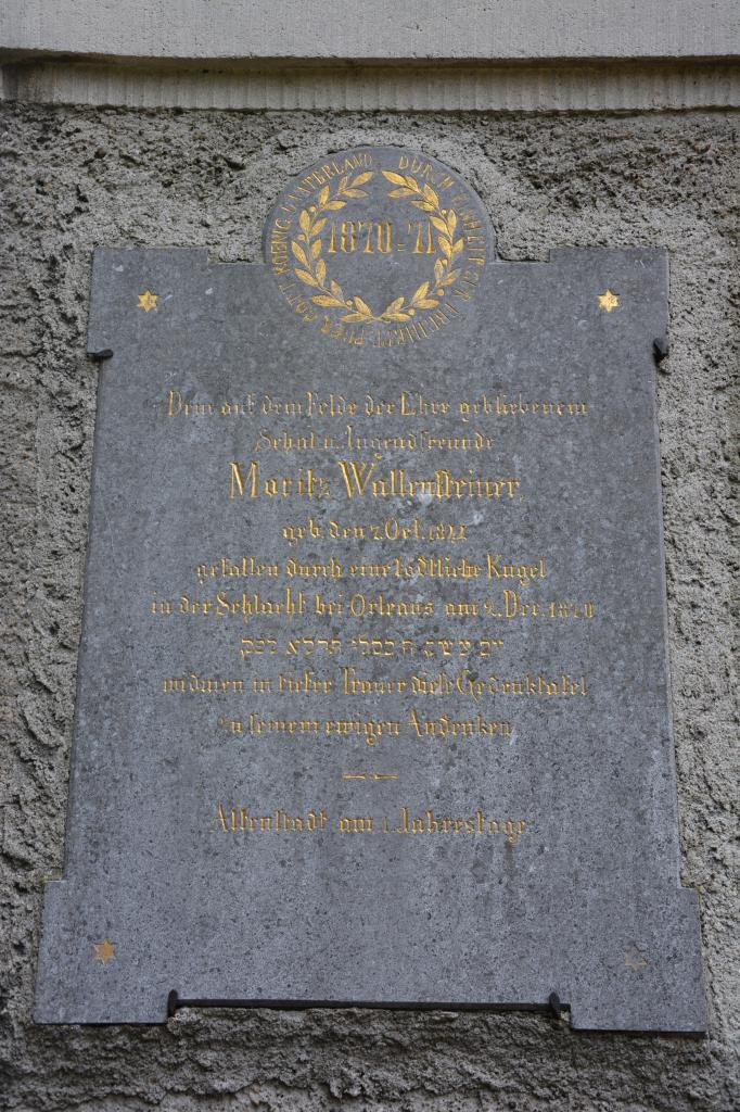 Auf dem jüdischen Friedhof im Ortsteil Illereichen befindet sich auf der linken Seite des Eingangstores ein reich verzierter Gedenkstein, auf dem in Goldbuchstaben des im Kriege 1870/71 FÜR GOTT KOENIG VATERLAND - DURCH EINHEIT ZUR FREIHEIT auf dem Felde der Ehre gebliebenen Mitgliedes der Israelitischen Gemeinde Altenstadt MORITZ WALLENHEIMER gefallen durch eine tödliche Kugel in der Schlacht bei Orleans am 2. Dec. 1870 gedacht wird. Auf der rechten Seite des Tores ist ein weiterer Gedenkstein zu sehen, auf dem – ebenfalls in Goldbuchstaben – der folgende Text zu lesen ist: