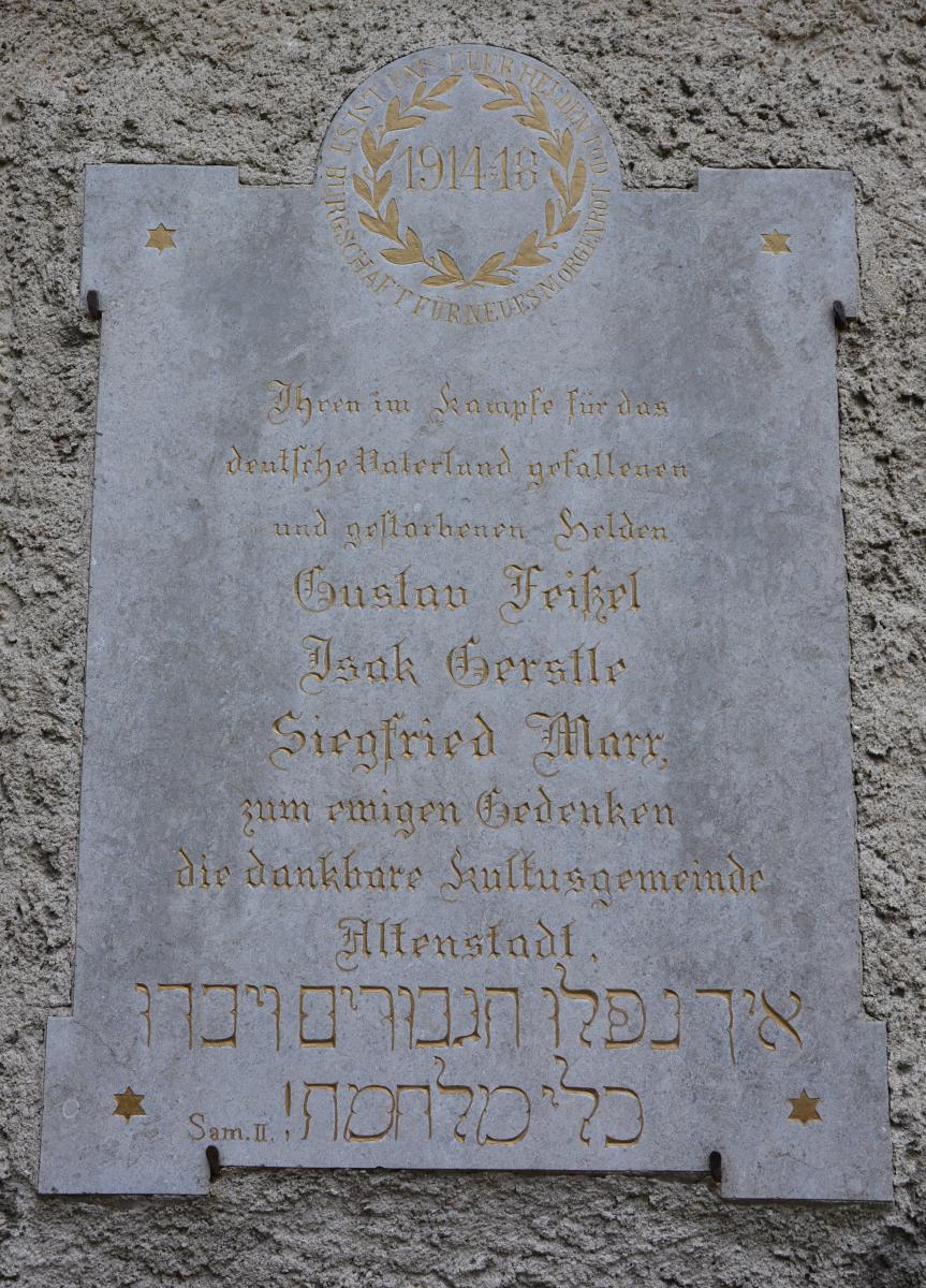 1914=18 Ihren im Kampf für das deutsche Vaterland gefallenen und gestorbenen Helden, Gustav Feißel, Isak Gerstle, Siegfried Marx, zum ewigen Gedenken die dankbare Kultusgemeinde Altenstadt.