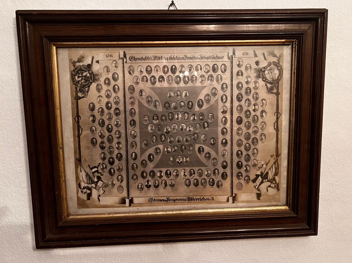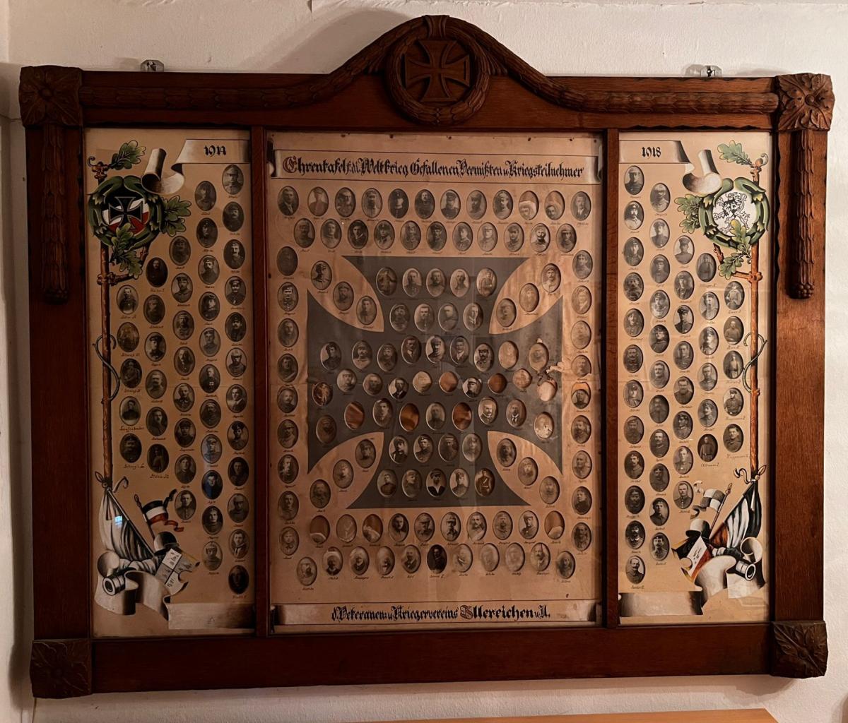 In diesem Kreuz waren ovale Bildtafeln der Gefallenen und Vermißten zu sehen, unter ihnen auch die der beiden Soldaten GUSTAV FEISSEL und JOSEF SIEGFRIED MARX.
