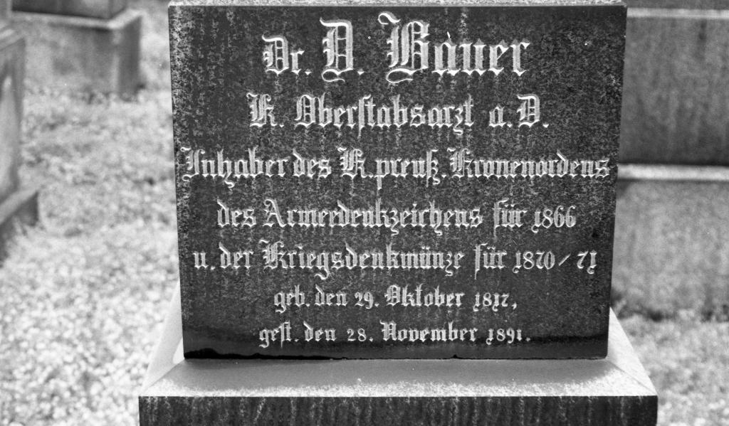Dr. D. Bauer K. Oberstabsarzt a.D. Inhaber des K. preuß. Kronenordens des Armeedenkzeichens für 1866 u. der Kriegsdenkmünze für 1870/71 geb. den 29. Oktober 1817, gest. den 28. November 1891