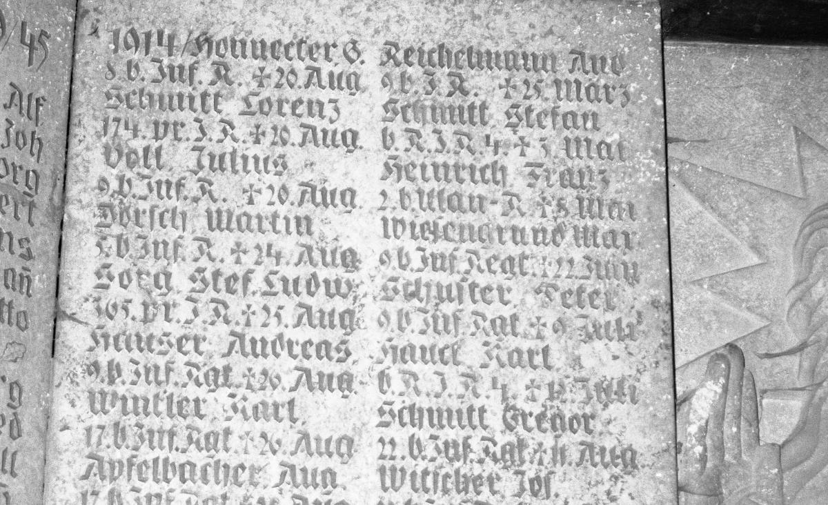 Im Inneren des Denkmals sind links und rechts einer Skulptur Gedenktafeln angebracht. Auf der linken Tafel kann man unter den Namen der Gefallenen, zum Kriegsjahr 1915 gehörend, auch den eines jüdischen deutschen Soldaten finden: