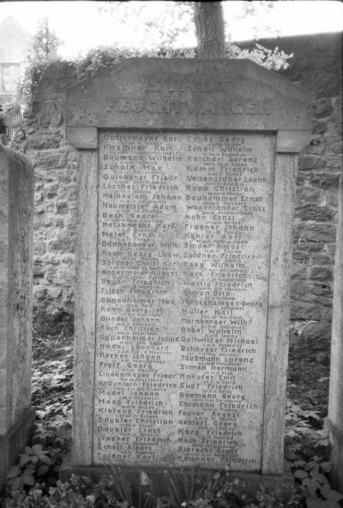 In der Stadt Feuchtwangen befindet sich die Gedenkstätte für die Gefallenen beider Weltkriege unweit des Marktplatzes in der Parkanlage „Am Zwinger" an der Unteren Torstraße. Hier steht – als Brunnen „umfunktioniert" – ein Denkmal für die Gefallenen von 1939 – 1945 ohne Namen. Rund 50m davon entfernt sind die Tafeln mit den Namen der Gefallenen des Ersten Weltkrieges am Nordende der Anlage an der Stadtmauer angebracht.