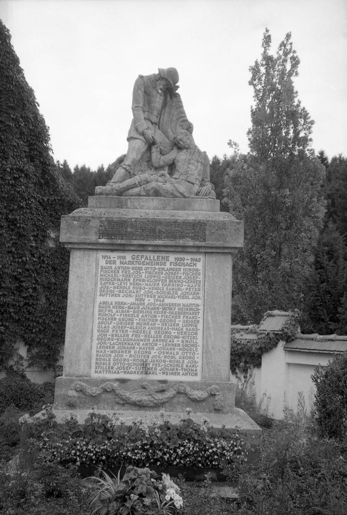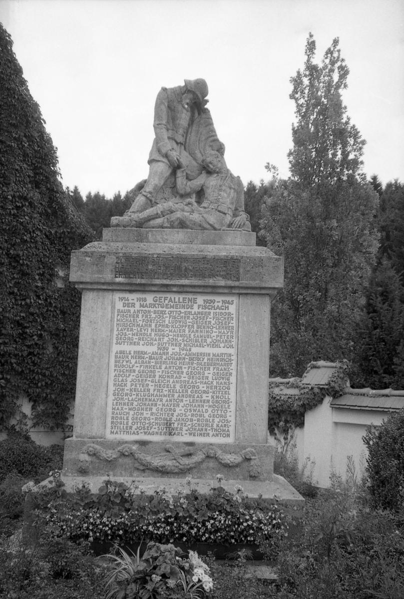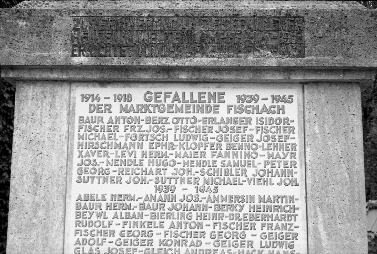 ZUR ERINNERUNG AN DIE GEFALLENEN IM WELTENKAMPFE 1914 – 1918 ERRICHTET VON DER GEMEINDE FISCHACH 1914 – 1918 GEFALLENE DER MARKTGEMEINDE FISCHACH 1939 – 1945. Auf der darunter befindlichen Gedenkplatte mit den Namen der Gefallenen beider Kriege sind auch die der gefallenen jüdischen Soldaten der Marktgemeinde Fischach angegeben: