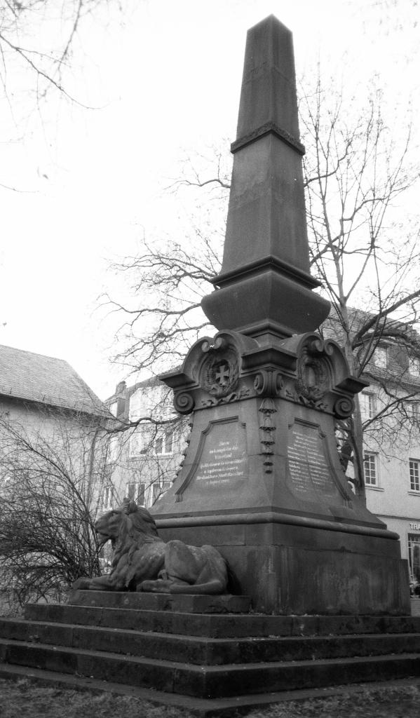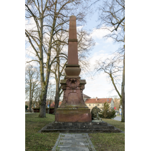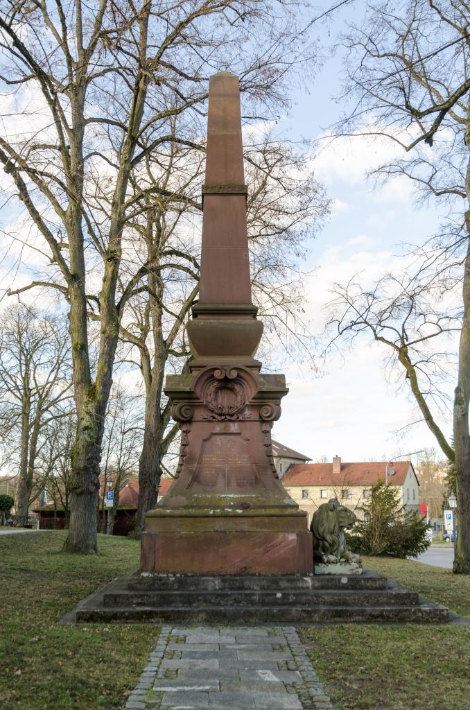 Zwischen Postgebäude und Bahnhof steht auf einer Grünfläche vor einer Gaststätte eine Gedenkstätte in Form einer Pyramide für die Kriegsteilnehmer und Gefallenen des Einigungskrieges 1870/71 mit der Inschrift: Ihren im Kampf für das Vaterland gebliebenen Heldensöhnen tapferen Kriegern. Die dankbare Stadt Hassfurt. 14. August 1904. Darunter kann man den bayerischen Löwen erkennen.